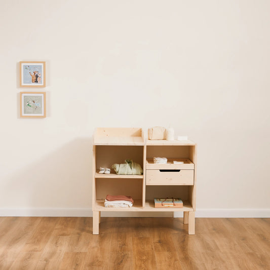 Un unico arredo in grado di supportare la loro crescita ed adattarsi a diverse esigenze. Da fasciatoio, con comodi ripiani e cassetti, si trasforma in portagiochi montessori, per poi diventare un vero e proprio modulo per l’armadio evolutivo EverGrow Maxi!