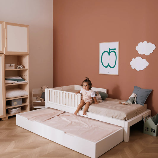 Il letto evolutivo è progettato per accompagnare il bambino in ogni fase della sua crescita. La sua struttura modulabile consente di adattare l'altezza e le dimensioni del letto, garantendo sicurezza e comfort a tutte le età. Dal lettino basso per i più piccoli fino a un letto singolo con testiera Fun per i ragazzi, il letto Montessori nabè si evolve per soddisfare le diverse esigenze.