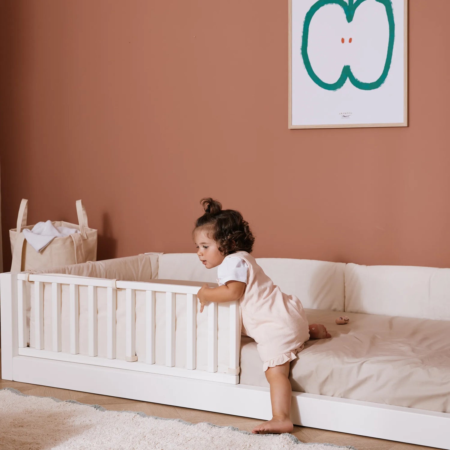 Il letto Montessori Evolutivo zero+ Earth con set sponde completo è il luogo ideale per le prime nanne. Il materasso evolutivo zero+, il coprimaterasso impermeabile, la coppia di cuscini Camomilla e i paracolpi assicureranno il massimo comfort.