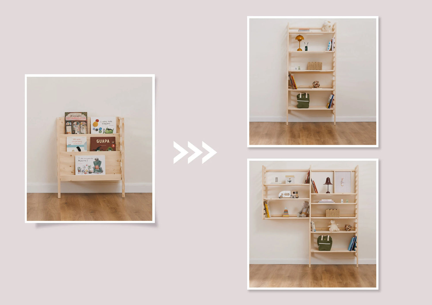Se hai già un letto zero+ (di dimensione 190x80 o 190x120), partendo dal modulo Small, potrai utilizzare le sponde del tuo letto per ampliare la tua libreria evolutiva EverGrow in Medium e Large.