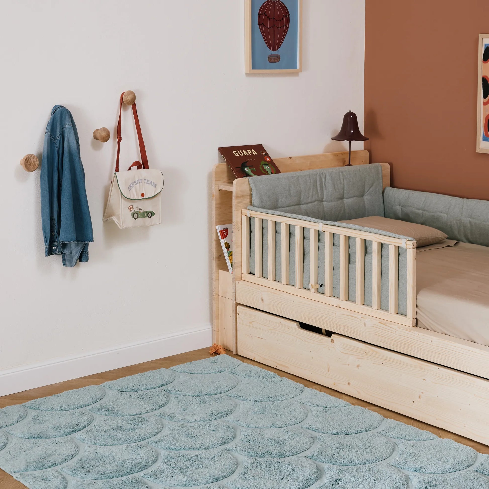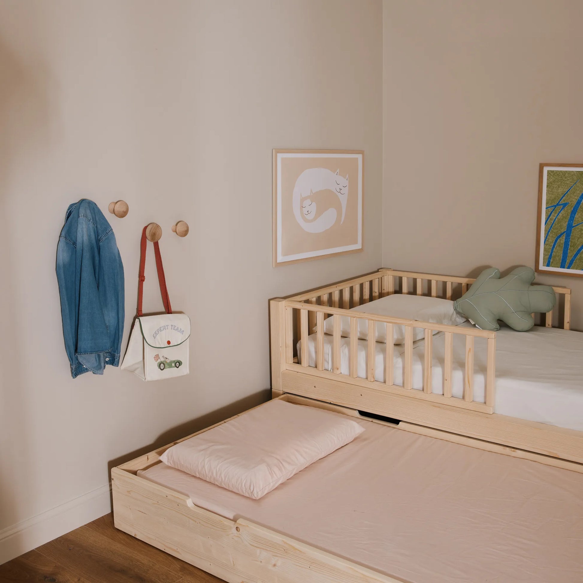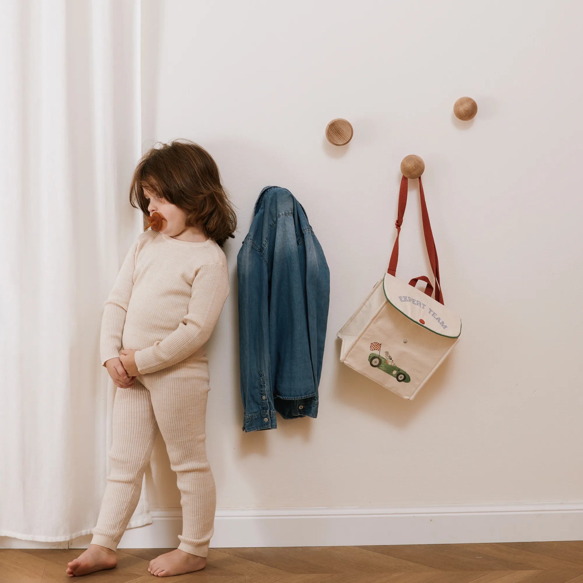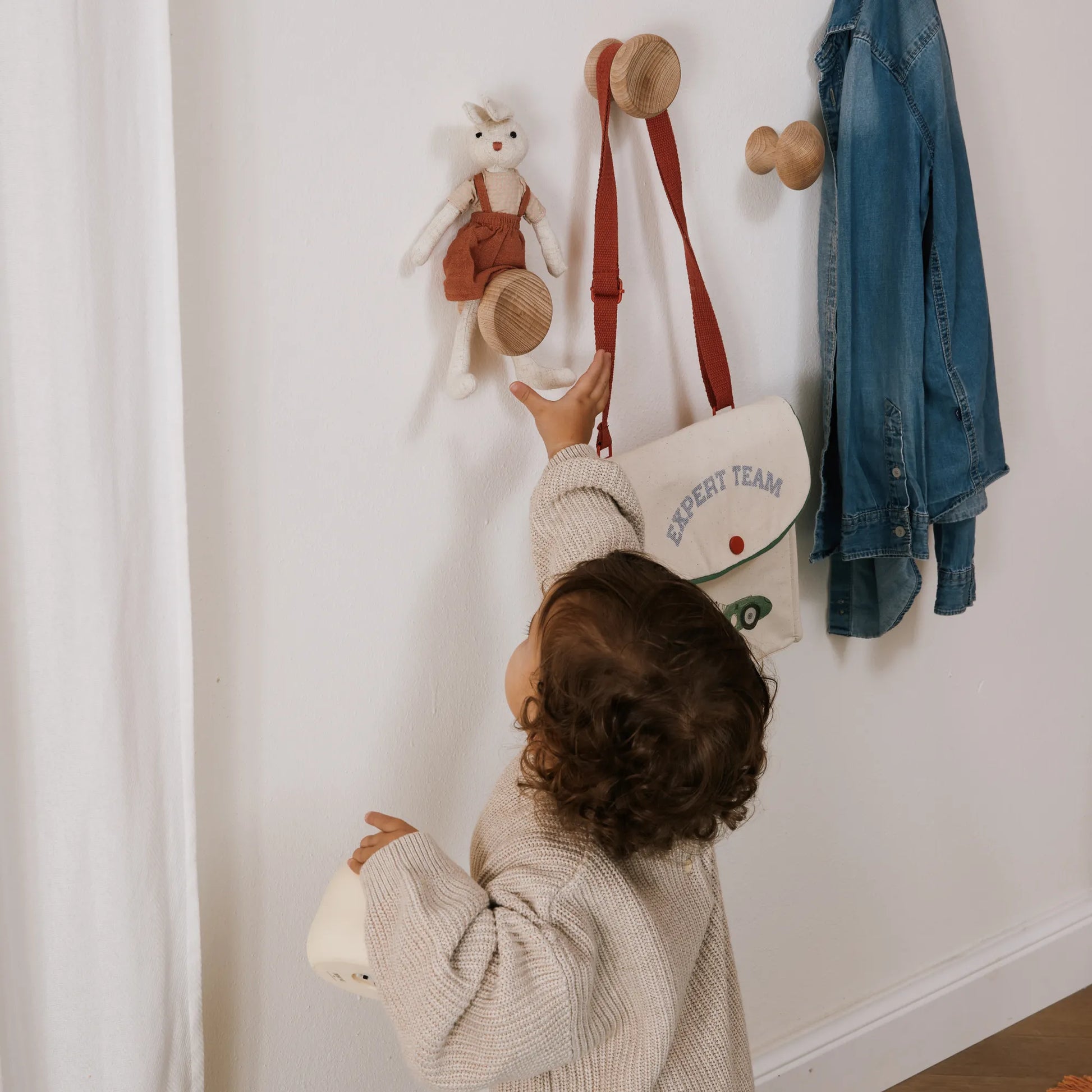 Gli appendiabiti Nabè sono realizzati in massello di faggio naturale, un materiale robusto e caldo che porta ordine e armonia nella cameretta. La loro estetica essenziale si integra alla perfezione con gli arredi Montessori, valorizzando gli spazi dedicati all’autonomia dei bambini.