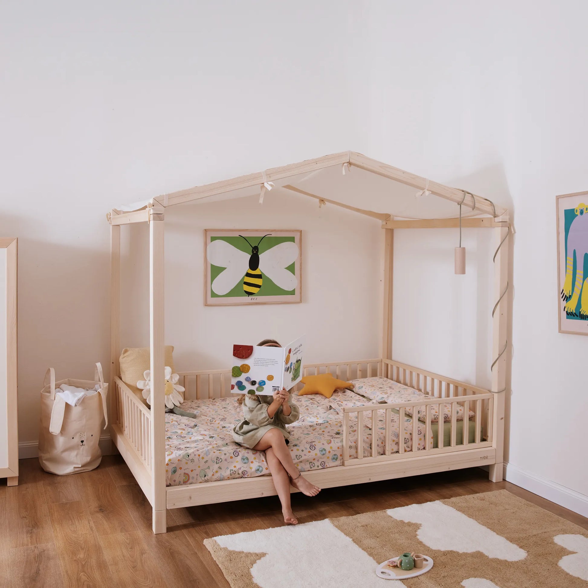 zero+ Dream è il letto montessoriano evolutivo creato da nabè per dare forma ai sogni dei bambini, creando uno spazio intimo per il sonno ed il gioco. Il suo tetto a casetta o baldacchino ricrea uno spazio intimo per i bambini dove trascorrere tempo prezioso, di sonno o di gioco. Le altezze e le forme sono studiate nel dettaglio per trasmettere armonia nella stanza e facilitare la gestione quotidiana.