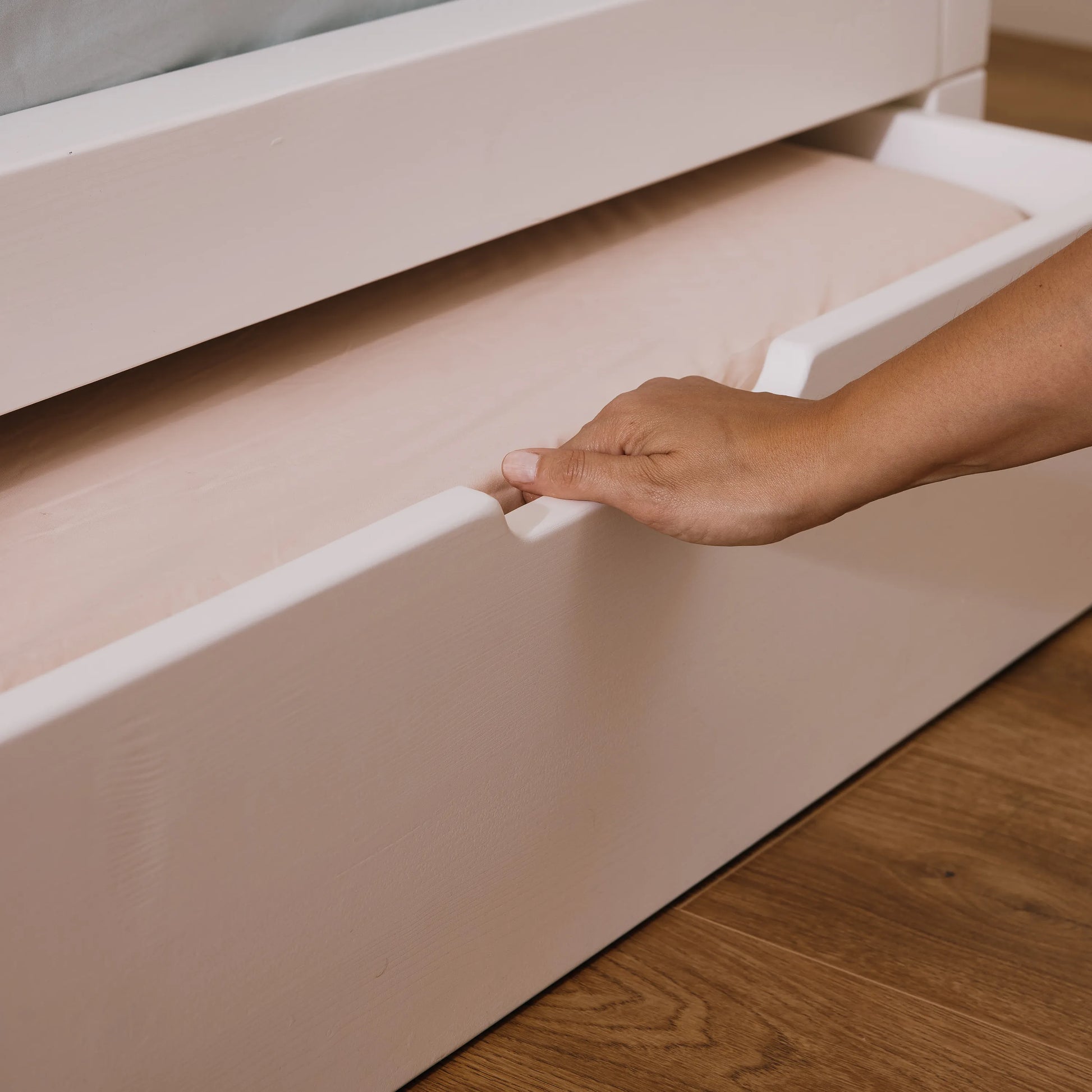 Si installa in pochi semplici step: con il kit piedOni bio paint, in omaggio con l’acquisto del Cassettone estraibile, si alza la struttura del letto principale (acquistabile separatamente) dove al di sotto potrai facilmente posizionare il Cassettone letto/contenitore estraibile grazie alle 4 comode ruotine integrate.