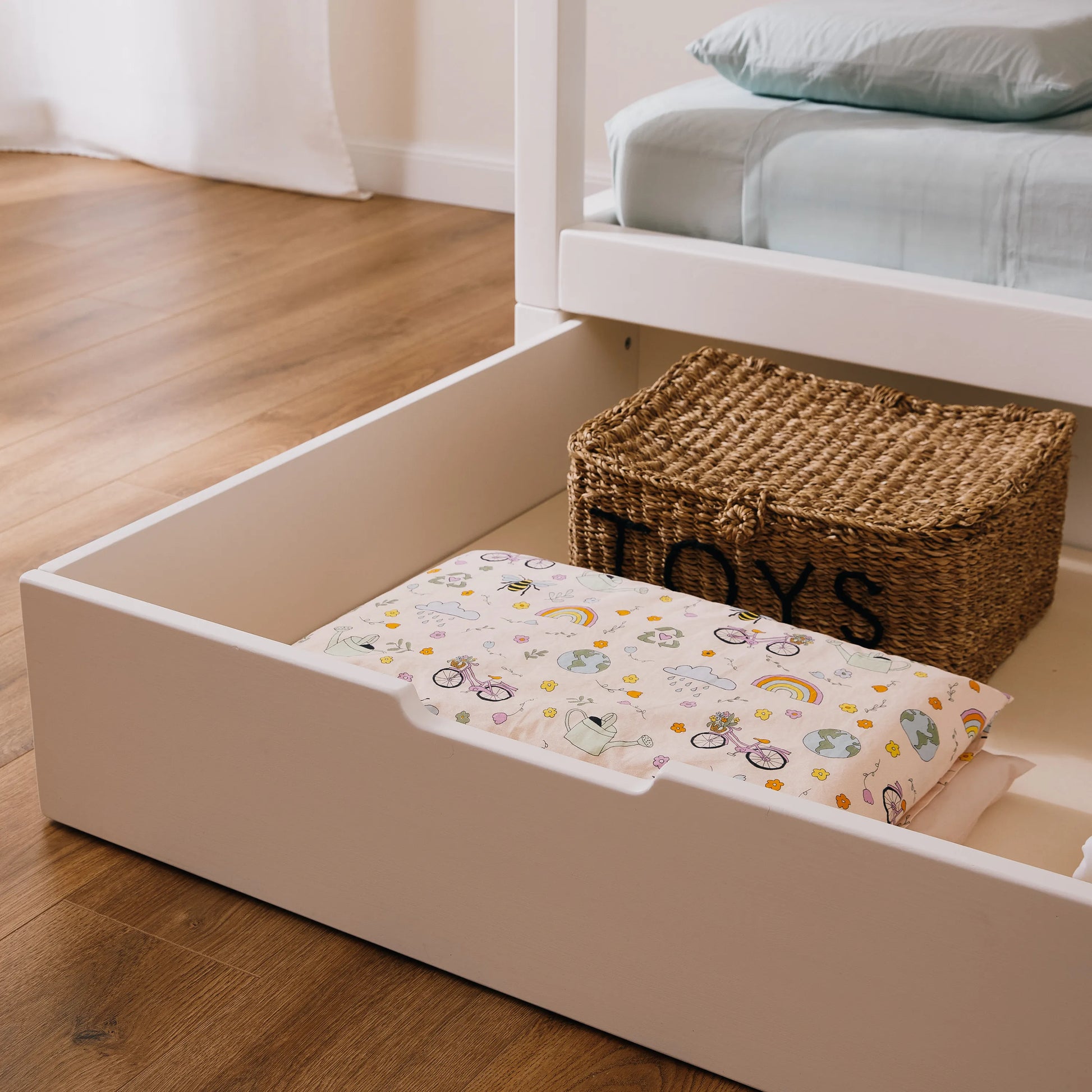 Si installa in pochi semplici step: con il kit piedOni bio paint, in omaggio con l’acquisto del Cassettone estraibile, si alza la struttura del letto principale (acquistabile separatamente) dove al di sotto potrai facilmente posizionare il Cassettone letto/contenitore estraibile grazie alle 4 comode ruotine integrate.