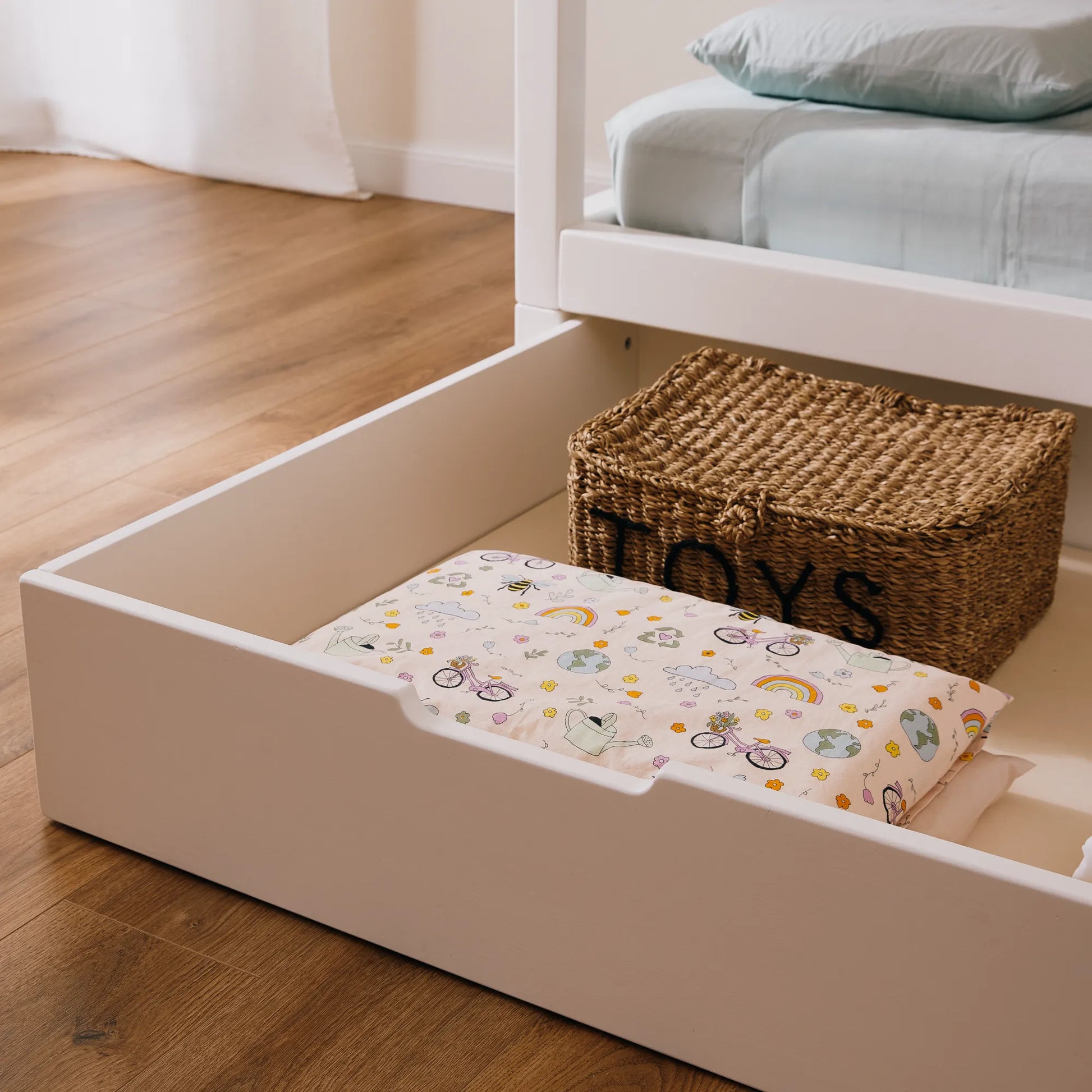 Si installa in pochi semplici step: con il kit piedOni, in omaggio con l’acquisto del Cassettone estraibile, si alza la struttura del letto principale (acquistabile separatamente) dove al di sotto potrai facilmente posizionare il Cassettone letto/contenitore estraibile grazie alle 4 comode ruotine integrate.