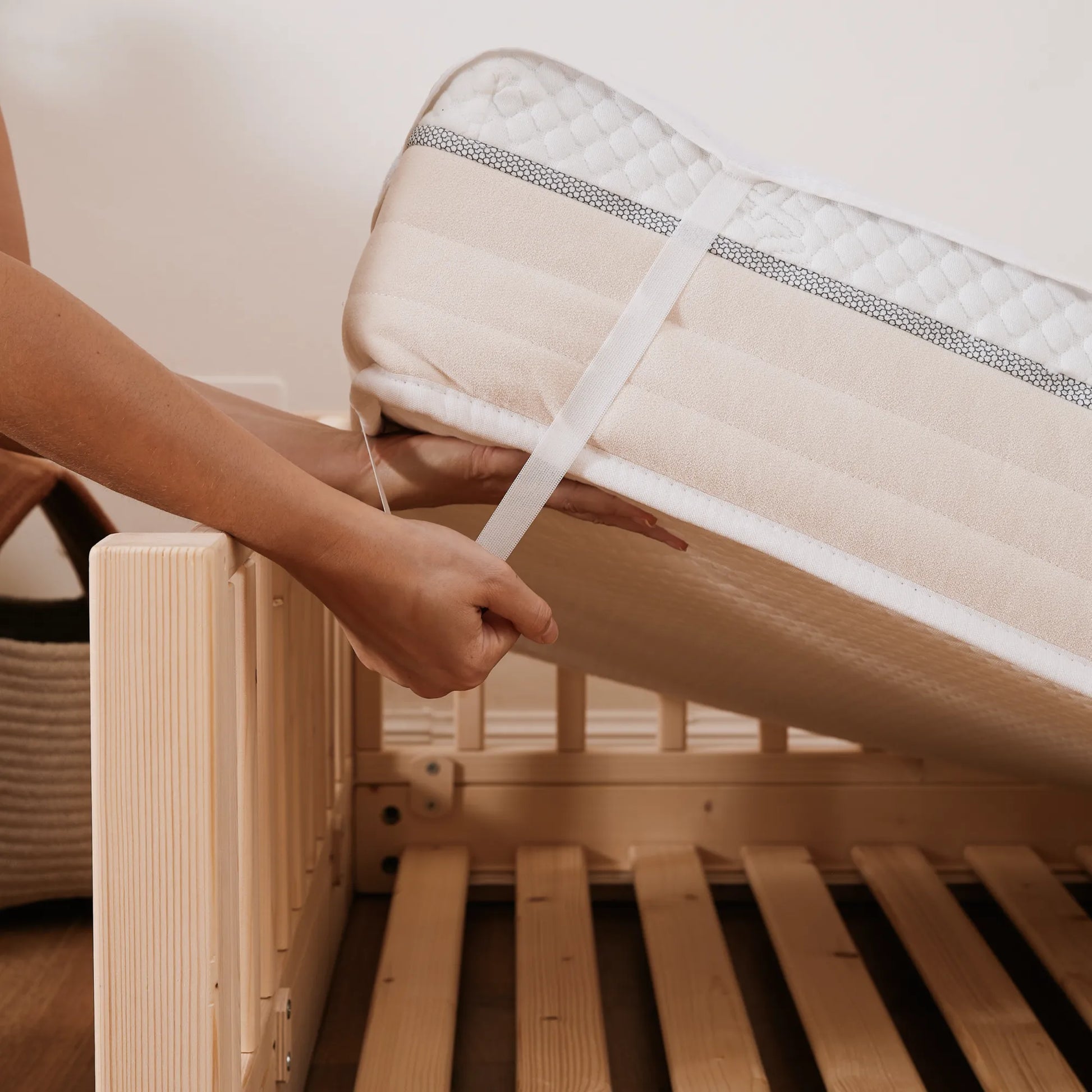Il materasso evolutivo zero+ by nabè offre una combinazione di pregiati materiali progettata per accogliere il sonno dei bambini di diverse età semplicemente modificando il lato o la posizione del materasso.
