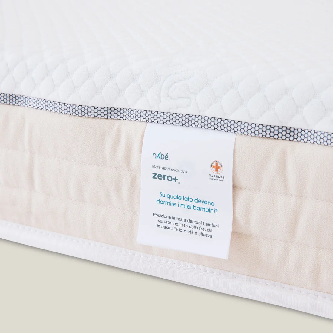 Il materasso evolutivo zero+ by nabè offre una combinazione di pregiati materiali progettata per accogliere il sonno dei bambini di diverse età semplicemente modificando il lato o la posizione del materasso.