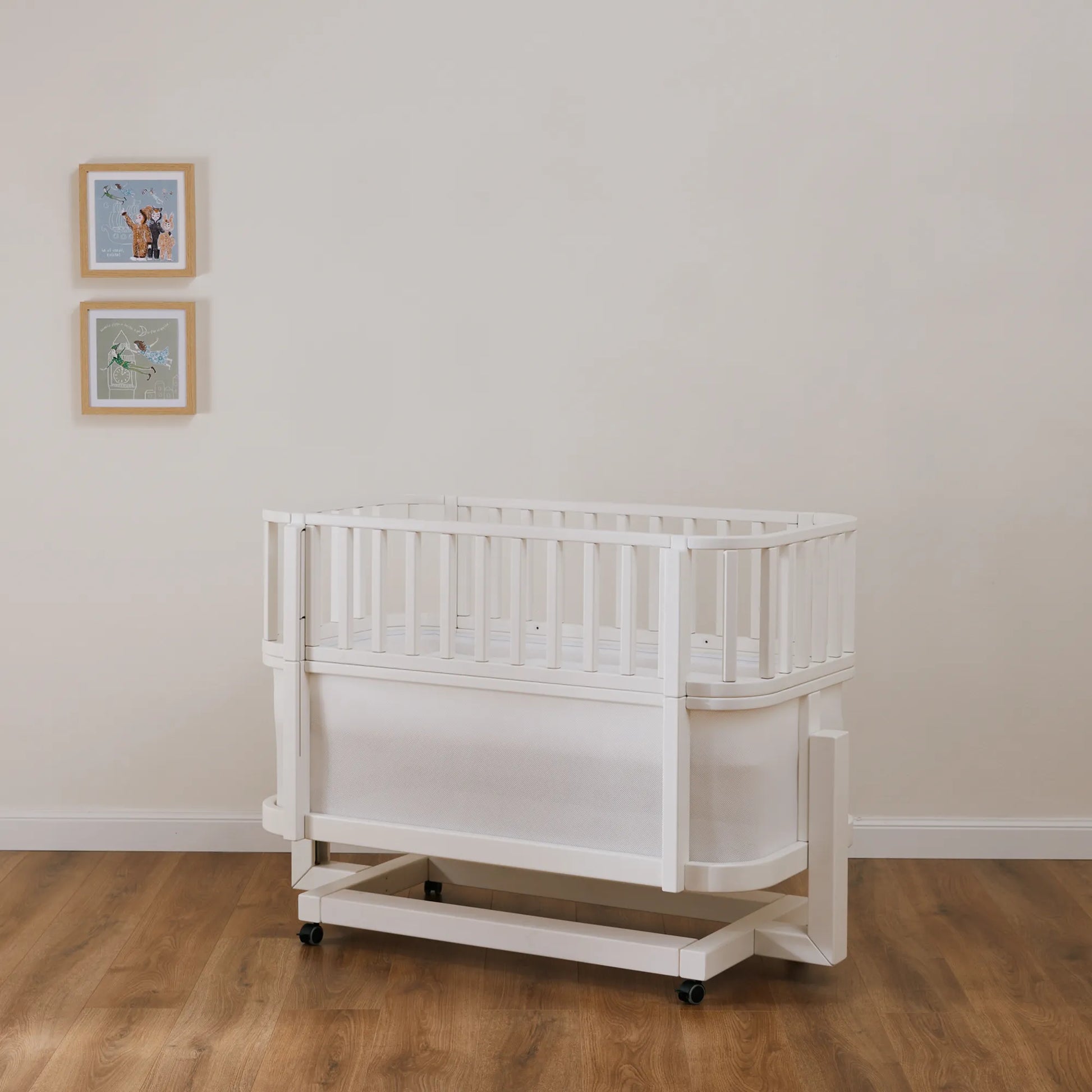 Basta un semplice gesto per alzare la sponda e riposizionare il materasso. Il tessuto in mesh 3d che avvolge la culla aggiunge sicurezza e comfort. Grazie alle comode ruote piroettanti, potrai sposare zero+ Una nella sua nuova cameretta.
