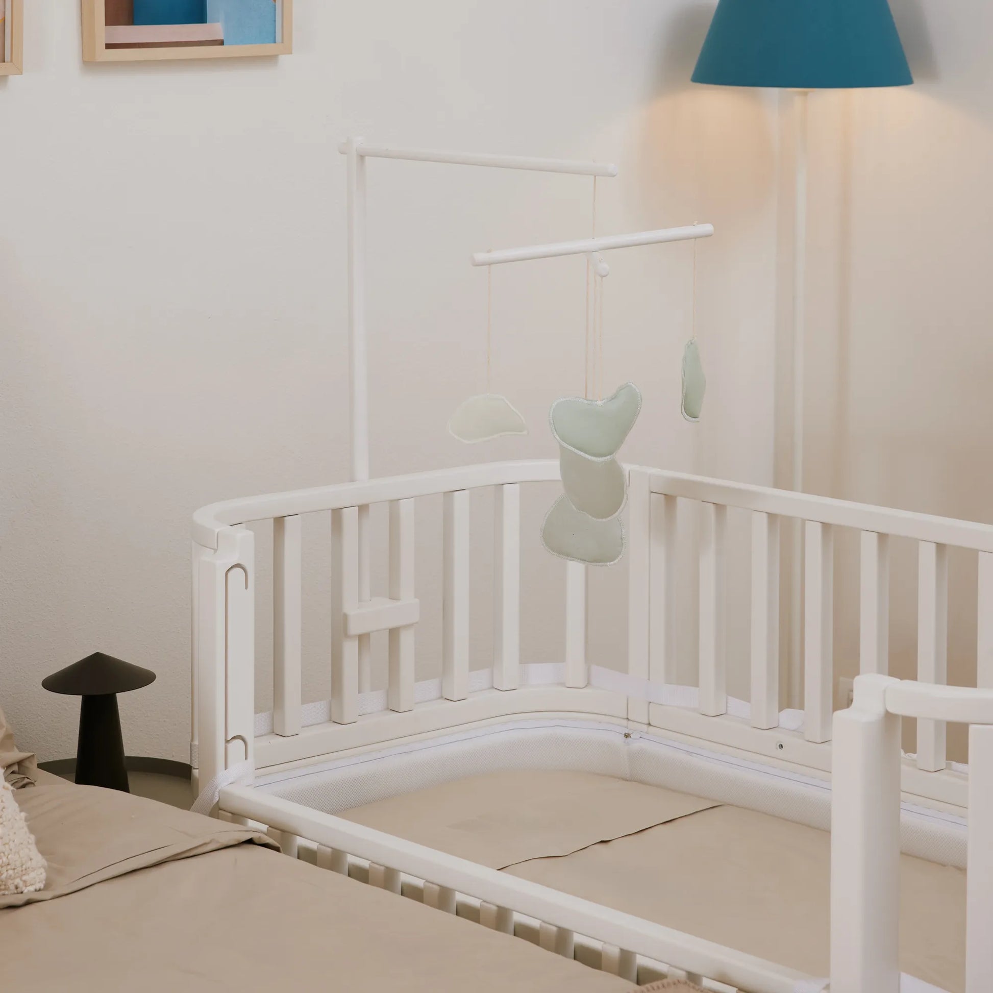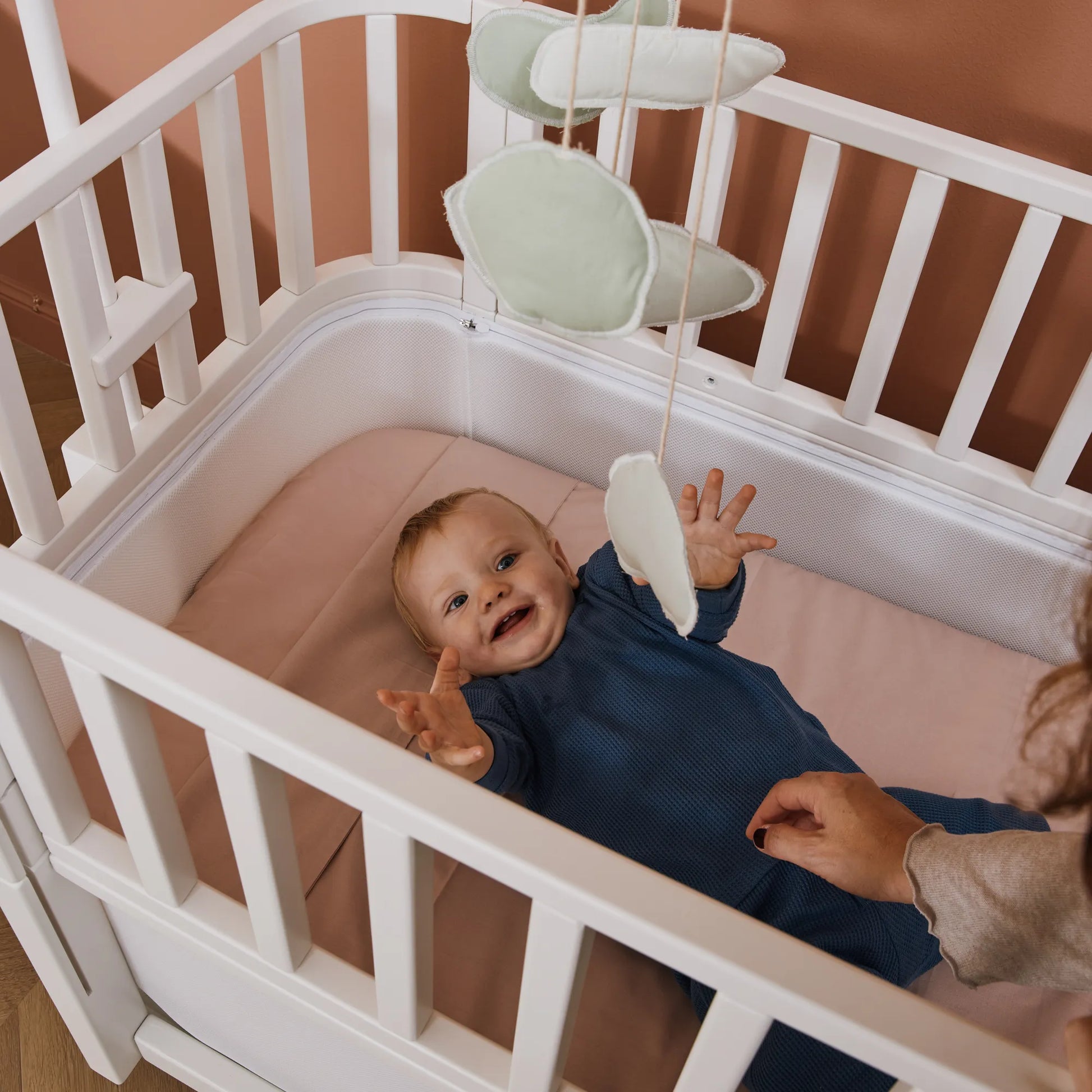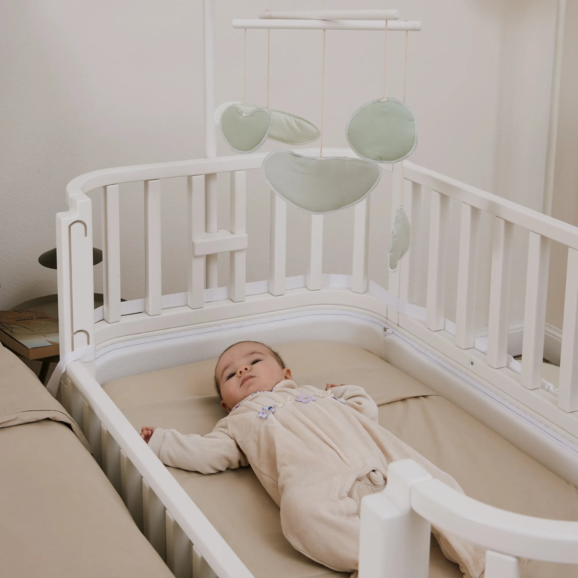 La giostrina Aria, pensata per la culla next to me evolutiva zero+ Una, porta sopra i primi sonni un piccolo cielo di calma e meraviglia. I suoi elementi morbidi ruotano con dolcezza e invitano i bambini a un senso spontaneo di tranquillità, creando un ritmo lieve che rassicura e accompagna ogni risveglio.