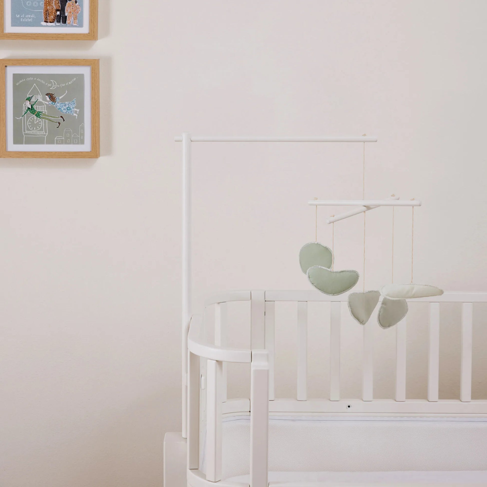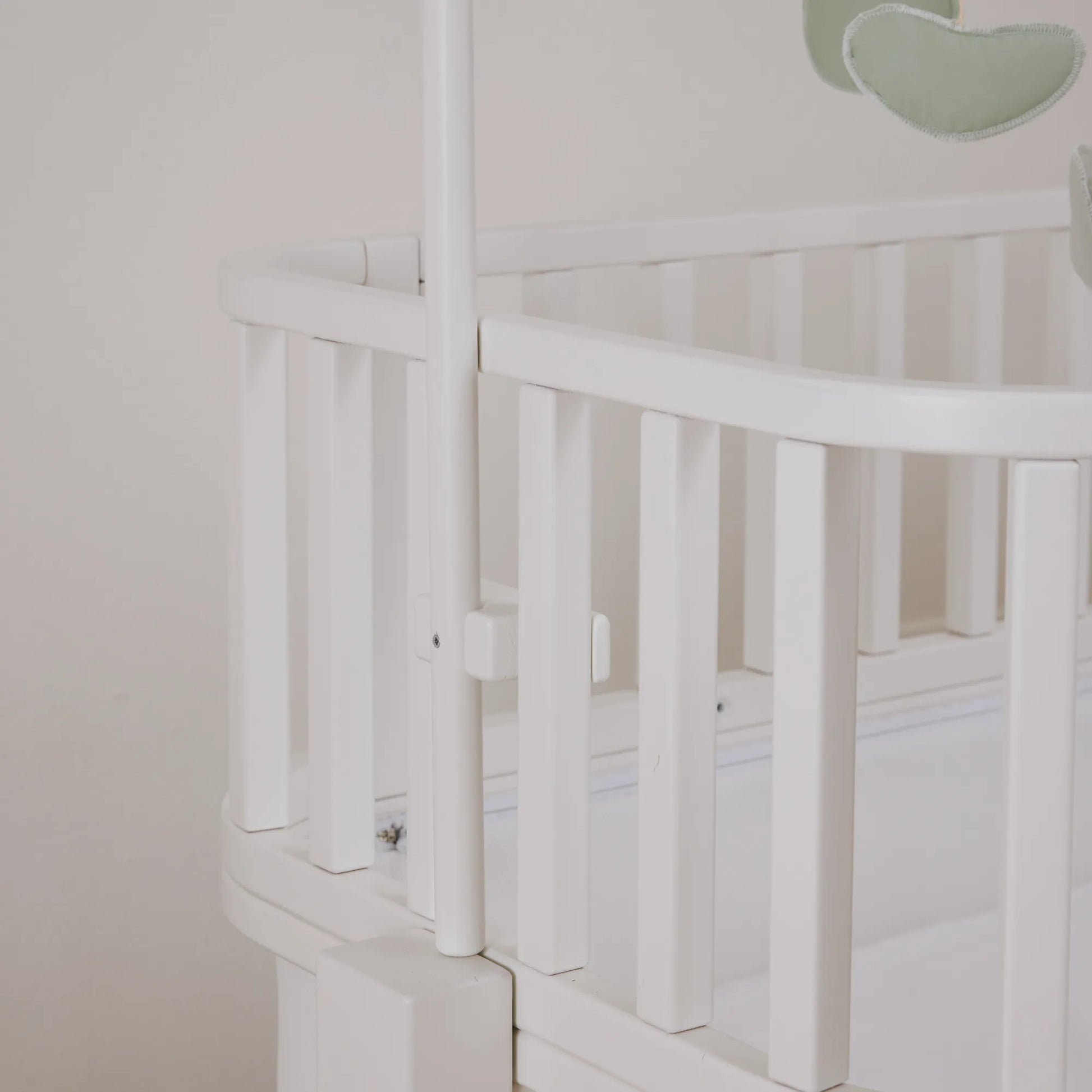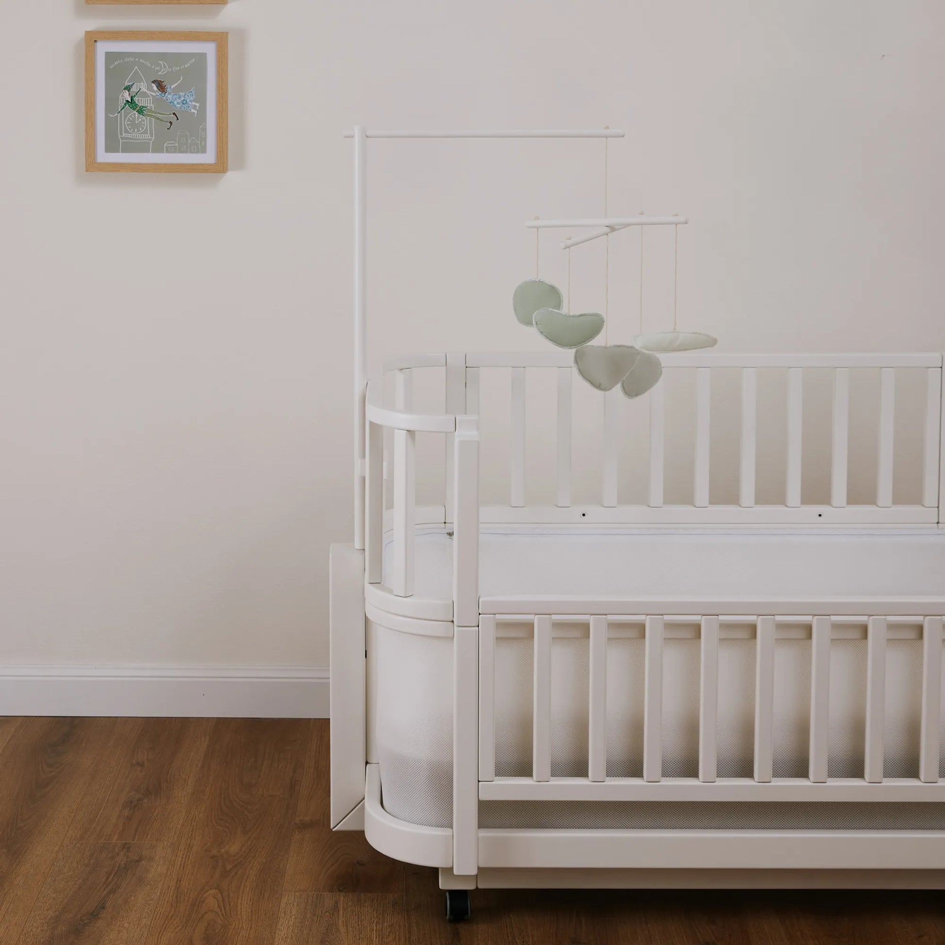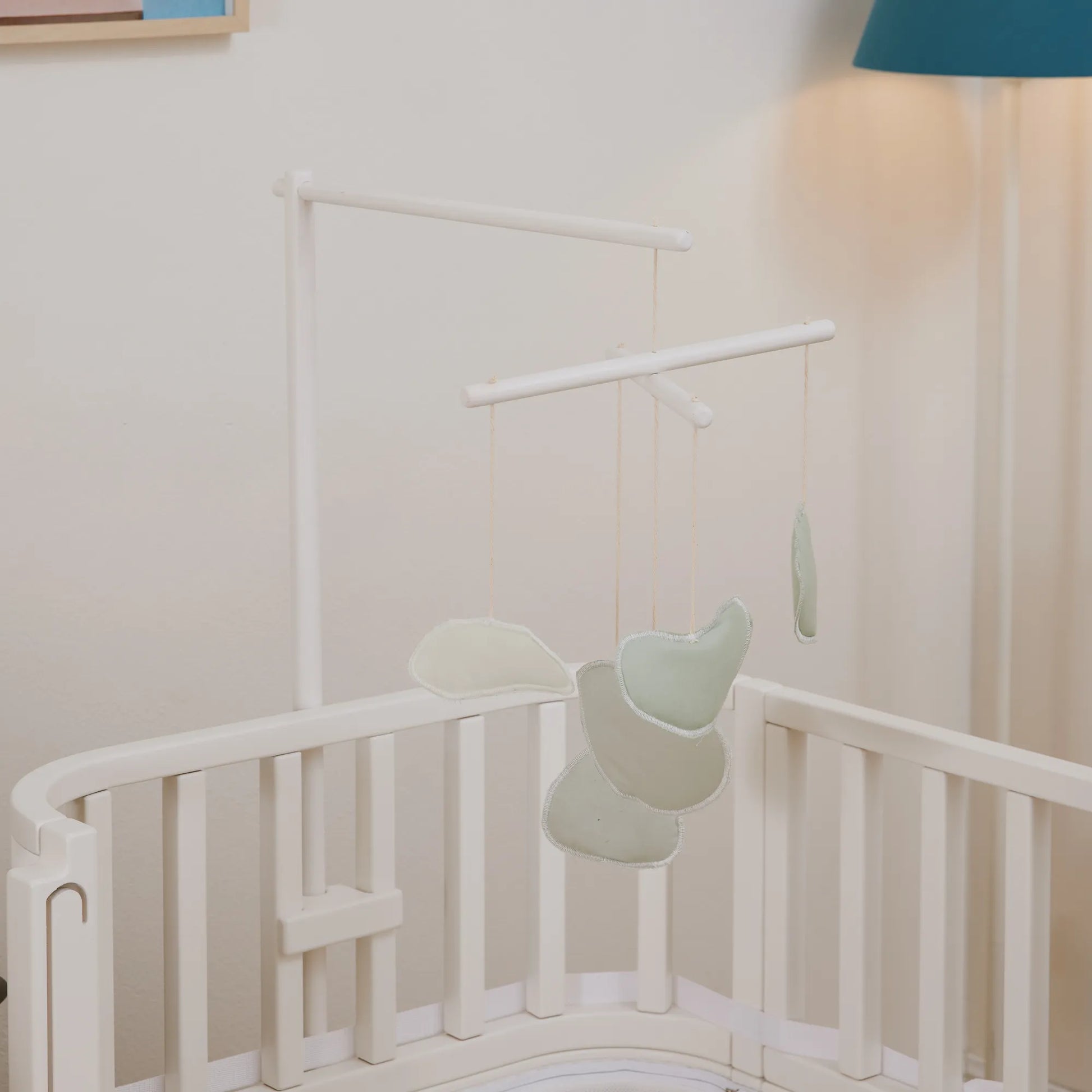 La giostrina Aria, pensata per la culla next to me evolutiva zero+ Una, porta sopra i primi sonni un piccolo cielo di calma e meraviglia. I suoi elementi morbidi ruotano con dolcezza e invitano i bambini a un senso spontaneo di tranquillità, creando un ritmo lieve che rassicura e accompagna ogni risveglio.