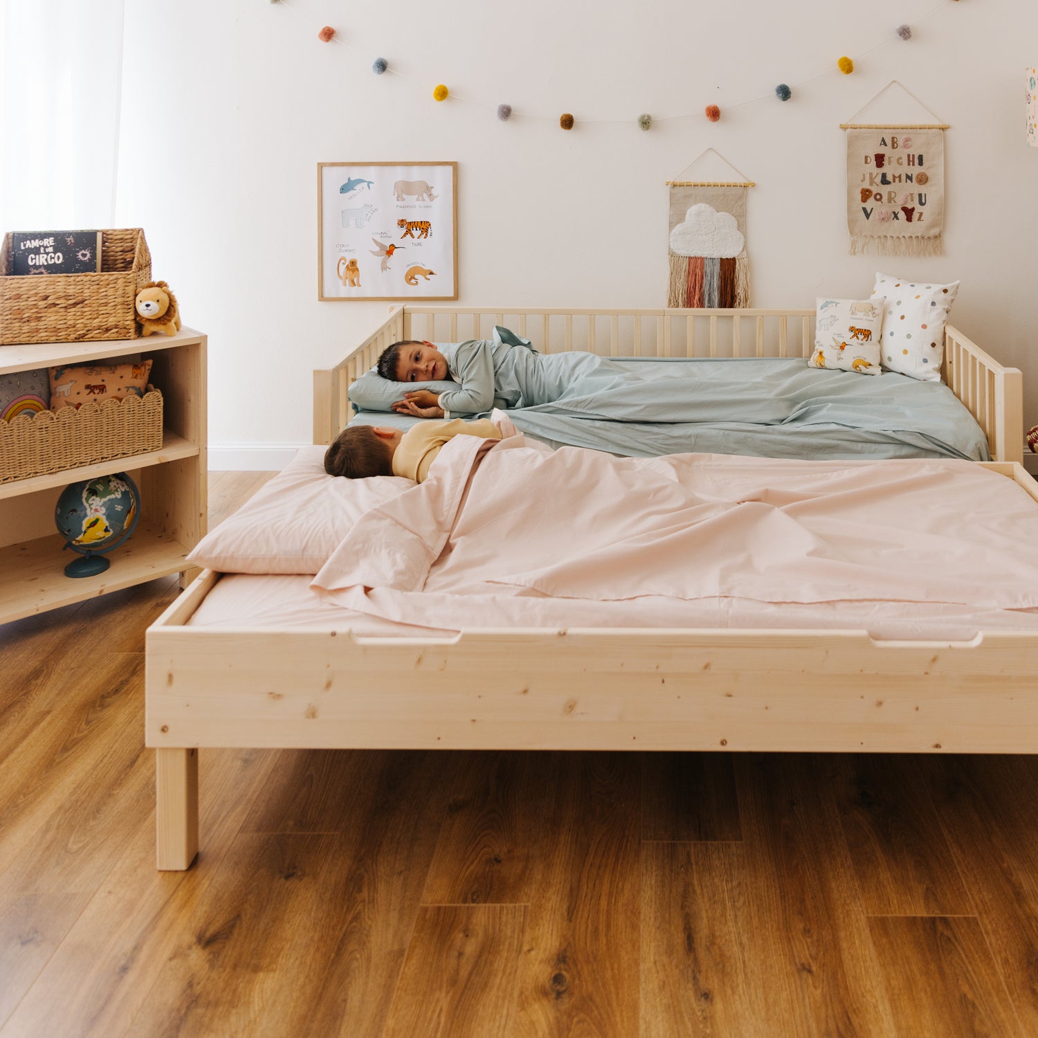 100% legno massello di abete scandinavo certificato PEFC, in grado di distribuire il peso in modo ottimale e sostenere genitori e bambini. Ideale per aggiungere un secondo letto.