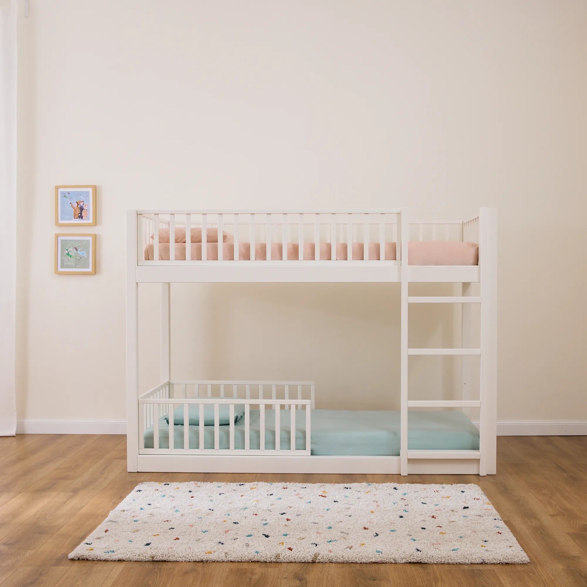 Il classico letto a castello Montessori, posizionato a terra, per stimolare l'autonomia dei bambini. Il set sponde completo è l'ideale per la sua sicurezza.