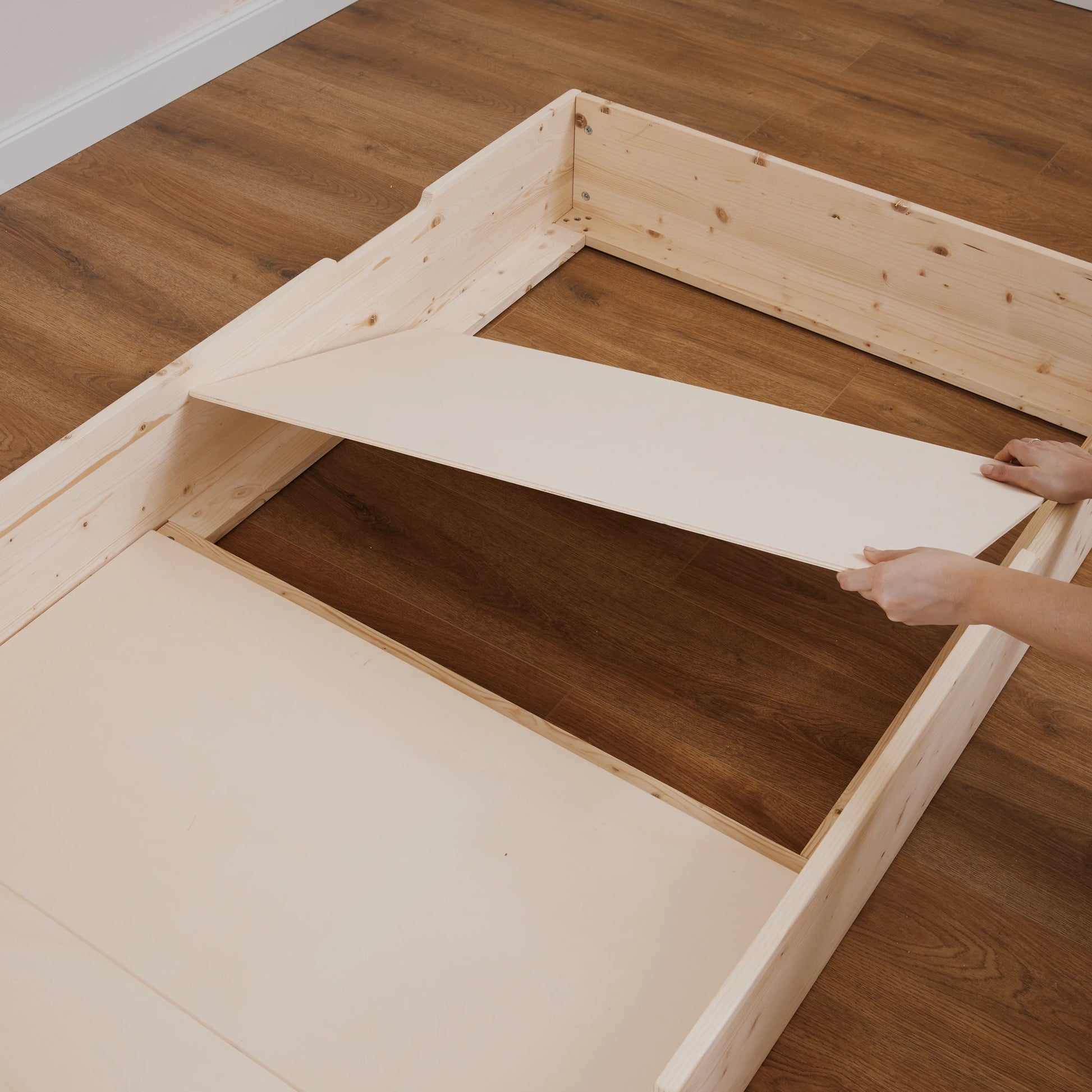 Come il letto, anche il cassettone estraibile zero+ può essere posizionato a terra o facilmente rialzato con il Kit Piedini o PiedOni!