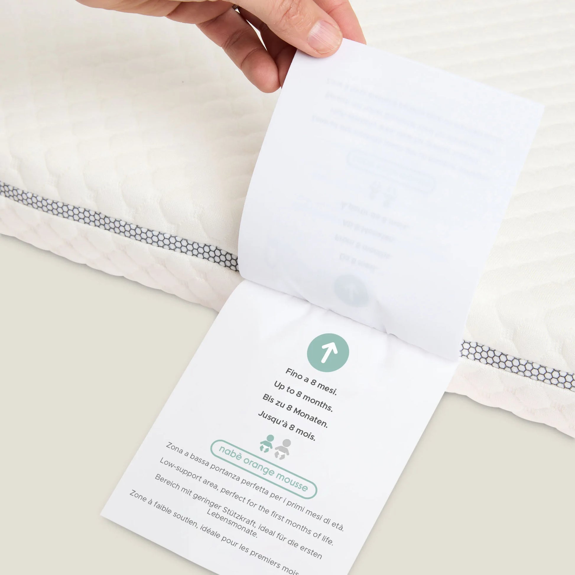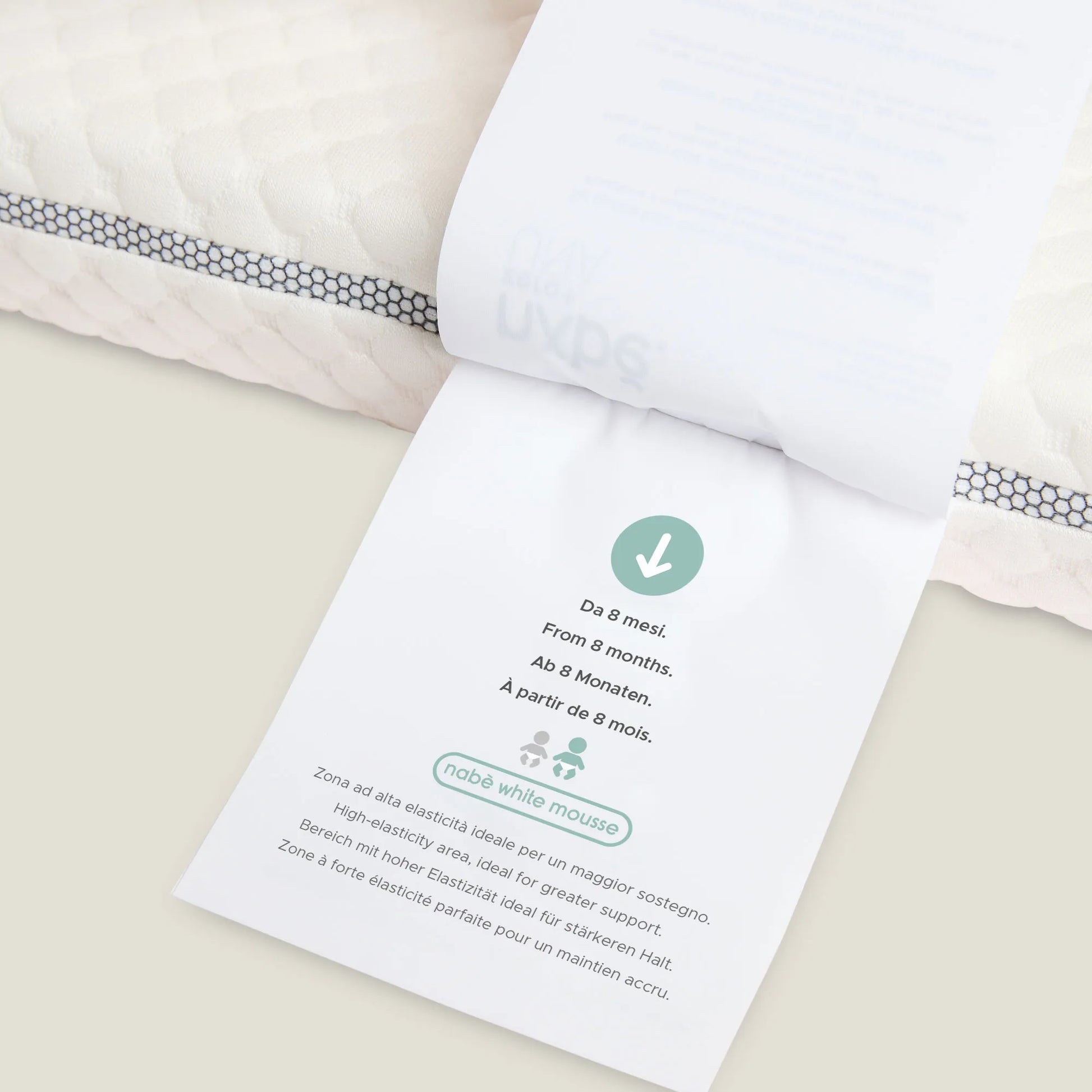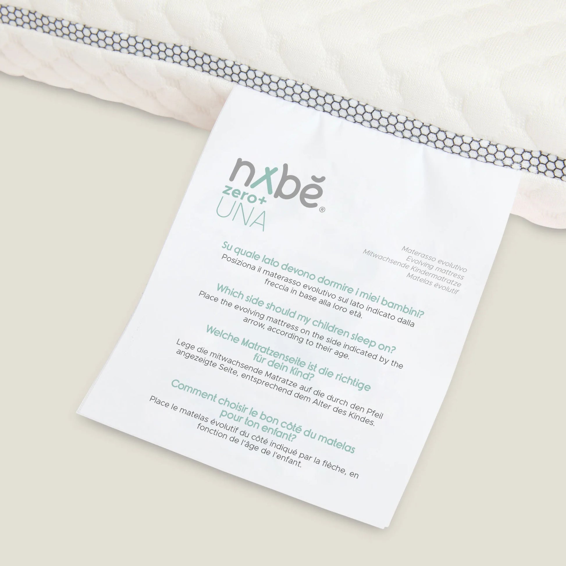 Il materasso evolutivo per la culla zero+ Una è progettato per offrire ai bambini un riposo sereno e sicuro fin dai primissimi giorni. Grazie alle specifiche mousse, garantisce sostegno ottimale in ogni fase; zona Orange Mousse fino ad 8 mesi, a bassa portanza, perfetta per i primi mesi di vita e zona White Mousse dagli 8 mesi ai 24, ad alta elasticità e ideale per maggior sostegno.
